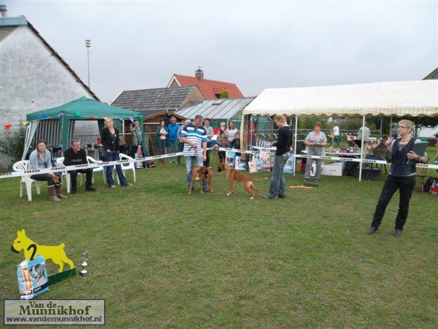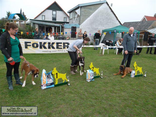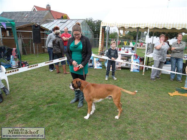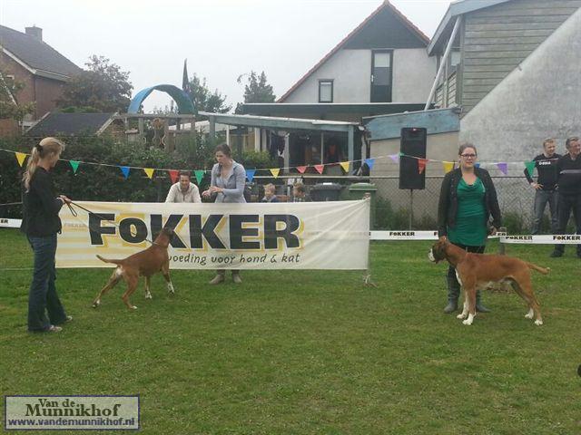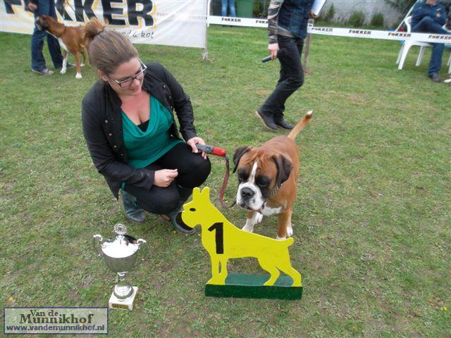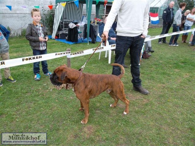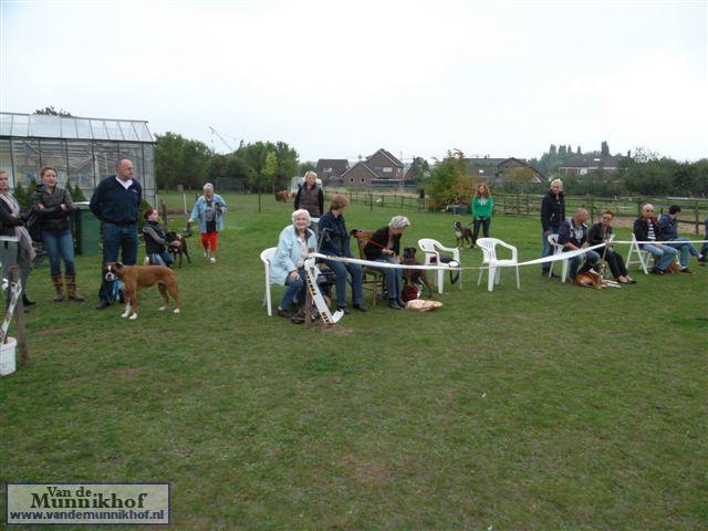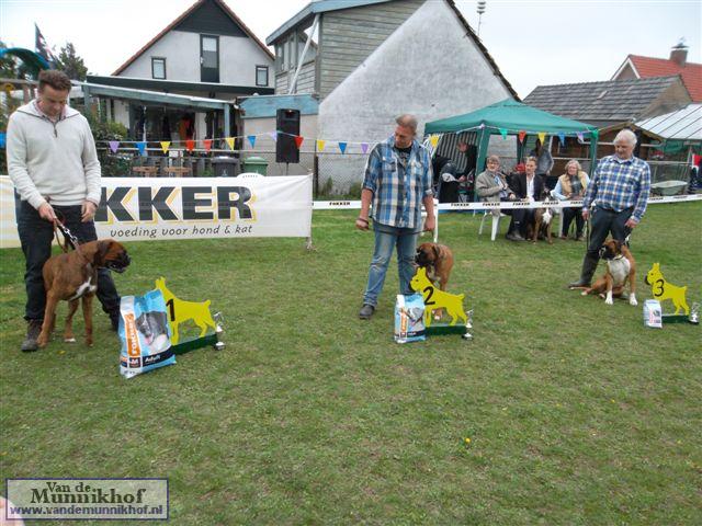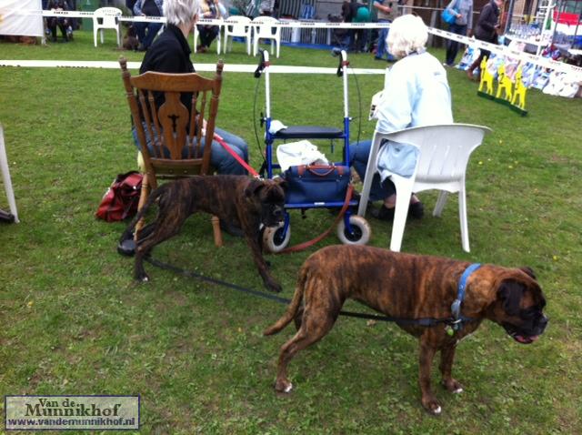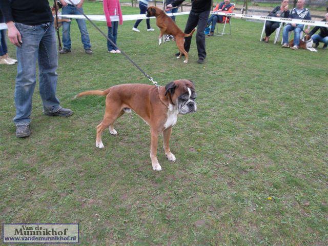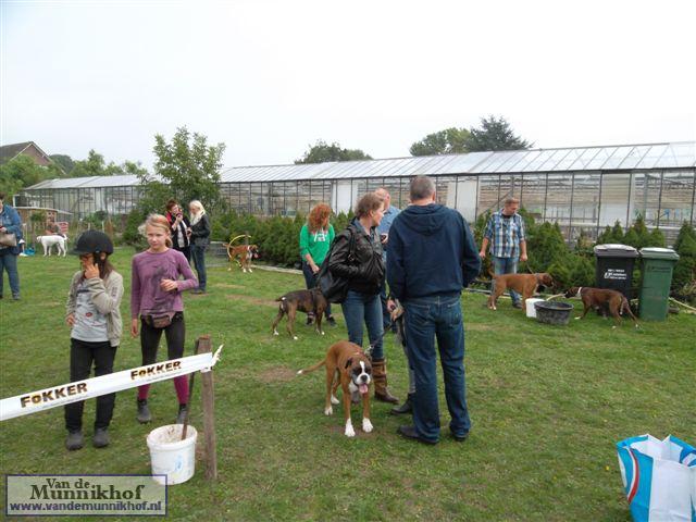 Het was weer reuze gezellig met 35 Munnikhofjes en ook het weer deed weer mee want het was dan wel bewolkt, het is droog gebleven. Iedereen heeft weer genoten van alle boxers, broertjes en zusjes werden weer opgezocht en er kwamen van allerlei leuke en lieve verhalen los. Dit jaar hadden we een vrouwelijke keurmeester wat de mensen heel leuk vonden, dus Miranda wat ons betreft, volgende keer weer. De winnaar bij de teefjes was Ninja en bij de reuen was het Djego, en van deze 2 werd Djego de dagkampioen, en kreeg hij de mooie wisselbeker mee. Ook Fokker diervoeders weer bedankt voor de prijzen, en ook voor de tassen met div. spulletjes. Vooral de piepbotten waren zeer in trek bij de boxers.