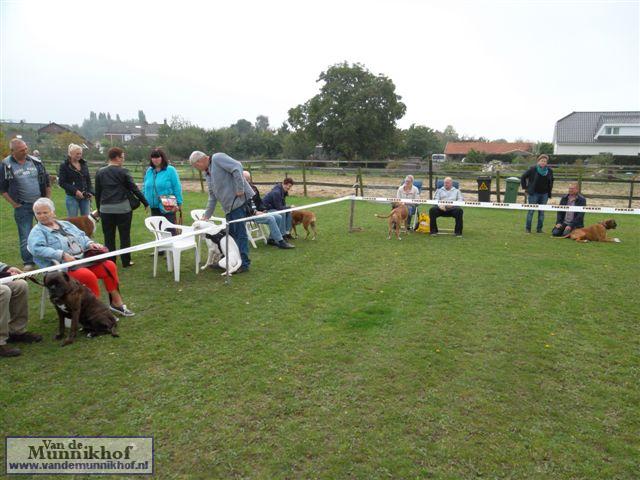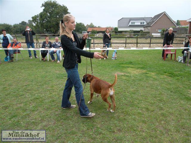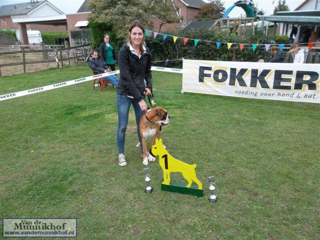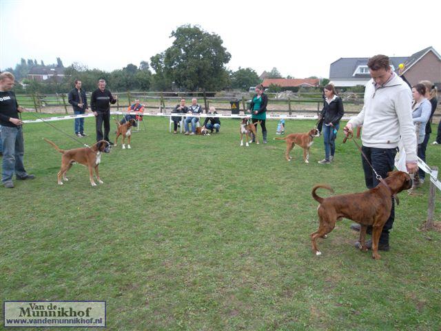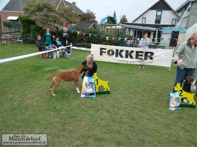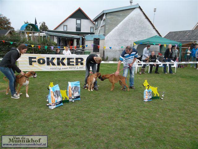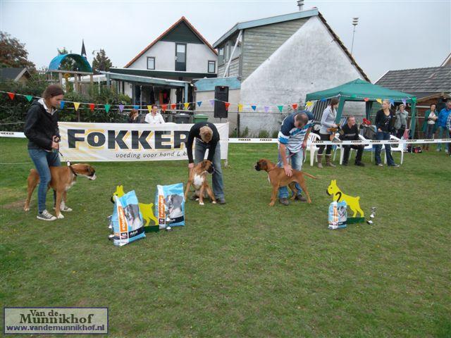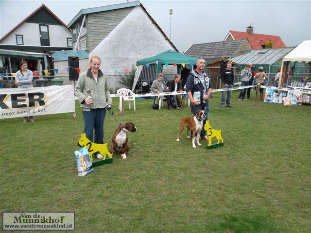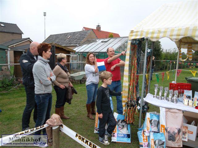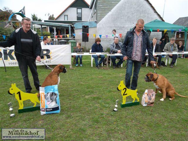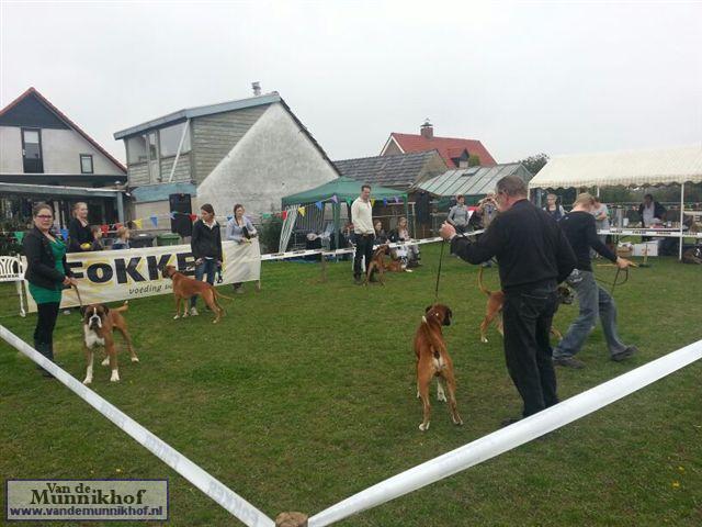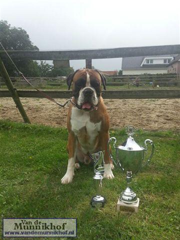 Het was weer reuze gezellig met 35 Munnikhofjes en ook het weer deed weer mee want het was dan wel bewolkt, het is droog gebleven. Iedereen heeft weer genoten van alle boxers, broertjes en zusjes werden weer opgezocht en er kwamen van allerlei leuke en lieve verhalen los. Dit jaar hadden we een vrouwelijke keurmeester wat de mensen heel leuk vonden, dus Miranda wat ons betreft, volgende keer weer. De winnaar bij de teefjes was Ninja en bij de reuen was het Djego, en van deze 2 werd Djego de dagkampioen, en kreeg hij de mooie wisselbeker mee. Ook Fokker diervoeders weer bedankt voor de prijzen, en ook voor de tassen met div. spulletjes. Vooral de piepbotten waren zeer in trek bij de boxers.