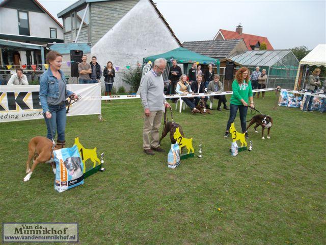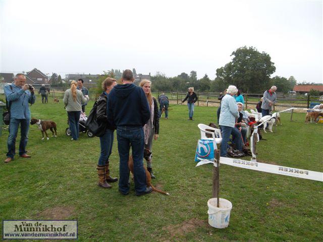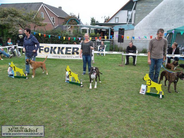 Het was weer reuze gezellig met 35 Munnikhofjes en ook het weer deed weer mee want het was dan wel bewolkt, het is droog gebleven. Iedereen heeft weer genoten van alle boxers, broertjes en zusjes werden weer opgezocht en er kwamen van allerlei leuke en lieve verhalen los. Dit jaar hadden we een vrouwelijke keurmeester wat de mensen heel leuk vonden, dus Miranda wat ons betreft, volgende keer weer. De winnaar bij de teefjes was Ninja en bij de reuen was het Djego, en van deze 2 werd Djego de dagkampioen, en kreeg hij de mooie wisselbeker mee. Ook Fokker diervoeders weer bedankt voor de prijzen, en ook voor de tassen met div. spulletjes. Vooral de piepbotten waren zeer in trek bij de boxers.